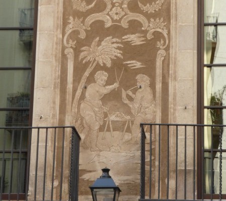 Casal del segle XVIII, de planta baixa, principal i dos pisos, amb un tercer pis afegit a cavall de l’antiga durant una reforma duta a terme els anys vint o trenta del segle XX i que afectà també els baixos amb l’obertura de les portes a banda i banda del gran portal d’arc rebaixat i molt motllurat. Al pis principal hi ha balcons de llosana de pedra amb motllures, mentre que els altres són de ferro forjat. El més important de la construcció, però, són els excel·lents esgrafiats, dels millors de l’època, que cobreixen les façanes. A la planta noble hi ha representats mitjançant grups de «putti», la Ceràmica, la Pintura, l’Escultura i l’Agricultura. A la segona planta apareixen, emmmarcats de grotescs, les personificacions del Danubi, el Nil, el Ganges i el Riu de la Plata. A la tercera, quatre grans medallons en forma d'»oscillus» penjats d’una garlanda. També hi ha esgrafiats a la façana del carrer Arai, però no a la d’Arenes. Tots plegats es poden datar cap a la dècada del setanta del segle XVIII.